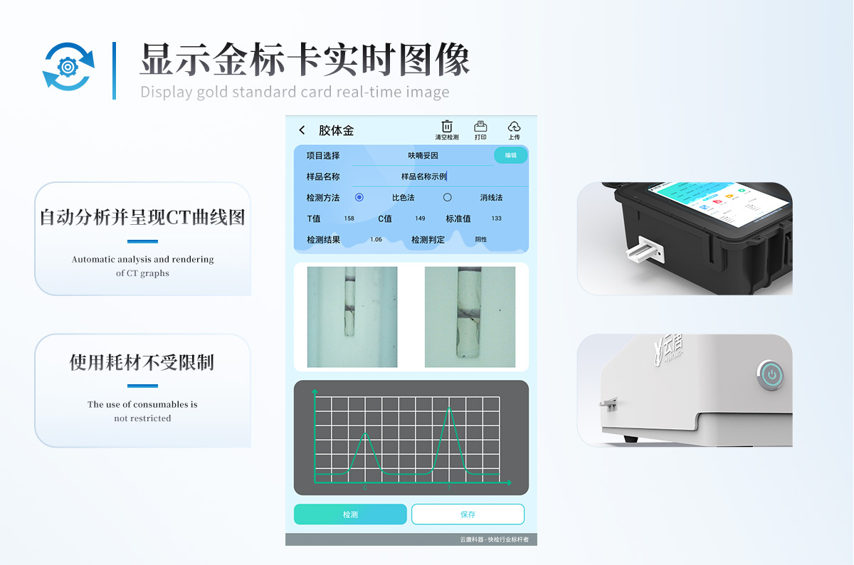 直插式自動掃描方式,可實時顯示金標(biāo)卡實時圖像,系統(tǒng)自動分析并呈現(xiàn)出CT曲線圖,CT線自動識別,無需手動調(diào)整,完成檢測后自動退出檢測卡。