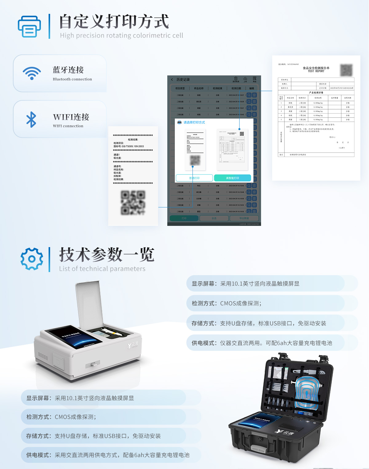 3.一體化便攜式快檢設(shè)備,采用交直流兩用供電方式,可連接車載電源,配備6ah大容量充電鋰電池,可以滿足現(xiàn)場及流動檢測使用的需求。儀器尺寸:43×35×20cm, 主機(jī)凈重:5.1kg